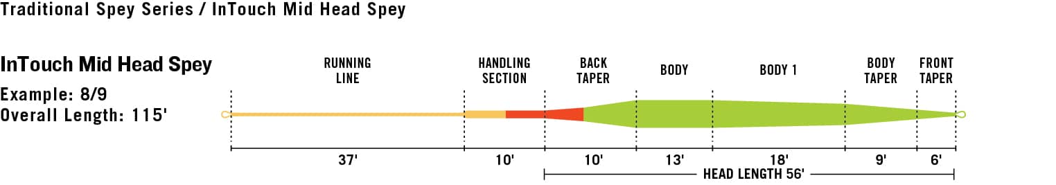 A linha InTouch Mid Head Spey tem uma cabeça de comprimento médio de fácil arremesso, com um formato de longo degrau na frente que se desenrola com extrema facilidade e eficiência. O comprimento da cabeça é ideal para varas de Spey entre 13 e 14 pés de comprimento e para rios de médio porte. A linha é construída com a alma de ultrabaixa elasticidade ConnectCore da RIO para o melhor em desempenho e apresenta as tecnologias AgentX e Extreme Slickness, bem como loops soldados em ambas as extremidades e um marcador de Ponto de Carregamento laranja brilhante.